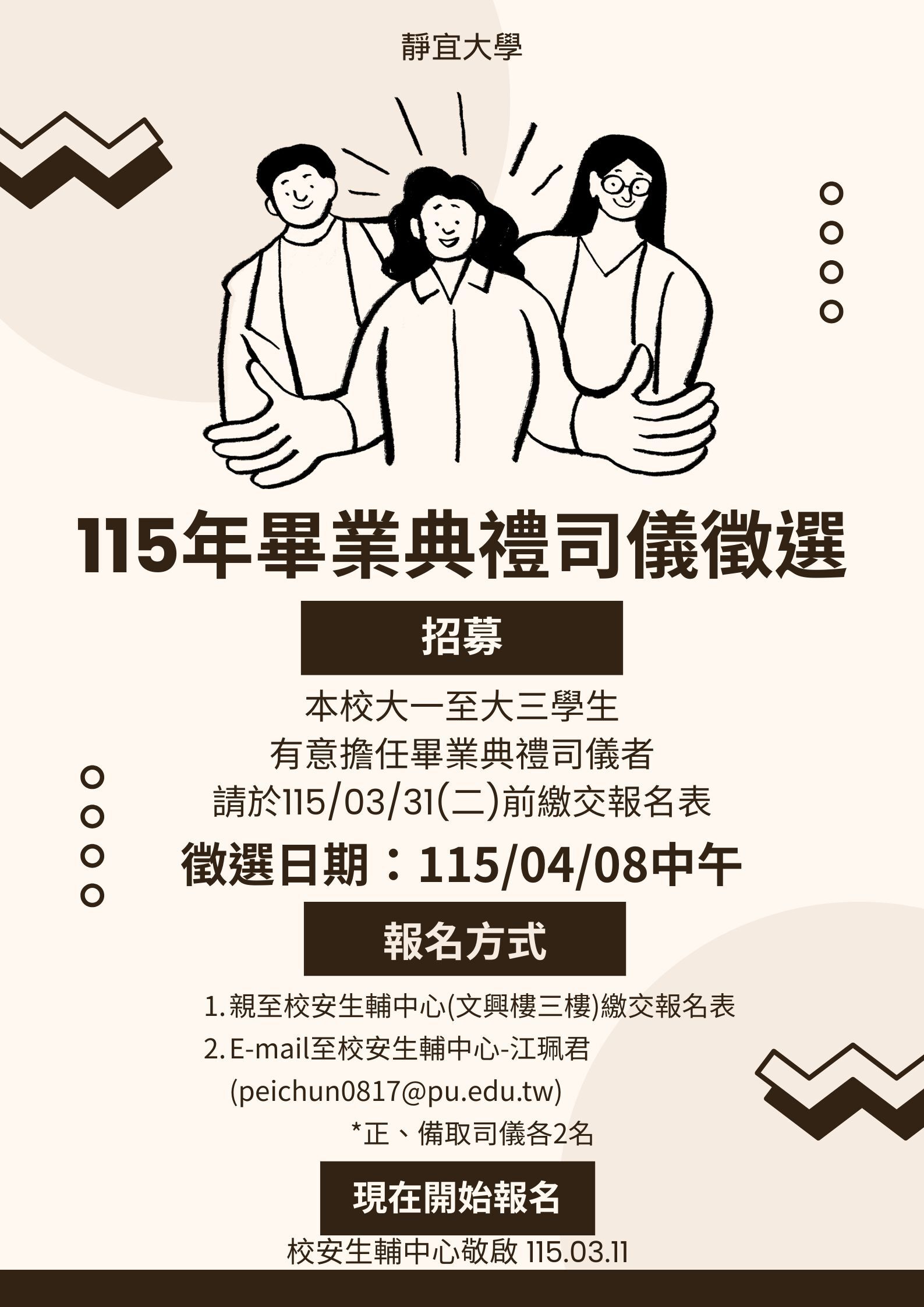 本校大一至大三學生有意擔任畢業典禮司儀者,請於115/3/31(二)前繳交報名表至校安生輔中心,