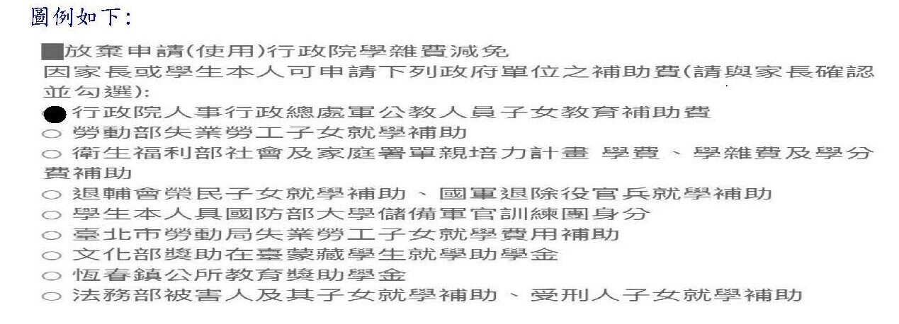 *欲放棄行政院減免學雜費17,500元,另申請就學優待減免或政府其他部會訧學中補助者,方式如下: