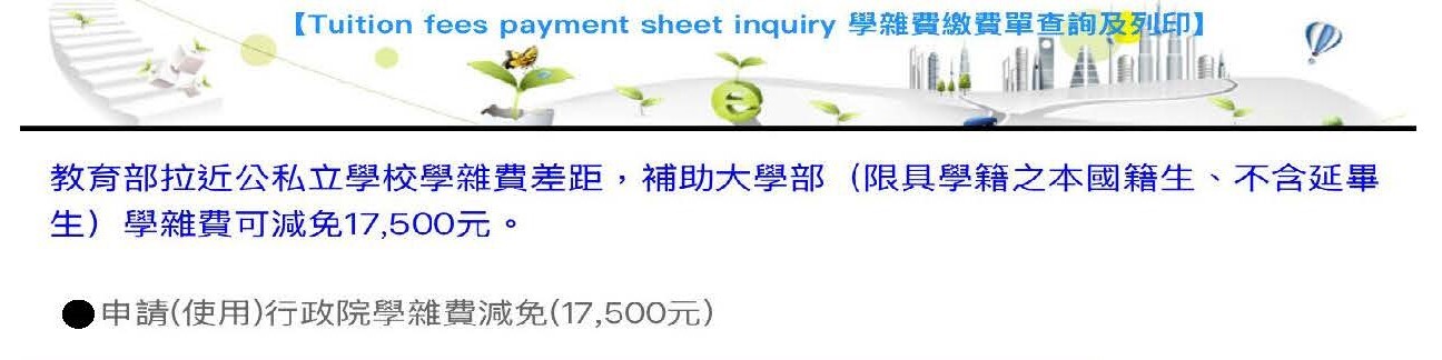 4.原欲申請「政府其他部會就學補助」,並已於繳費單系統選擇「放棄申請(使用)行政院減免學雜費」,如因補助身分資格不符,而需恢復「行政院減免學雜費」補助,請親洽或電洽生輔組辦理程序。(列印繳費單時,請謹慎選擇)